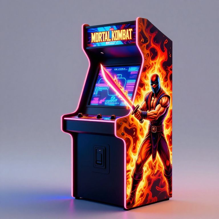 A high-definition 3D-rendered arcade cabinet featuring the iconic \"Mortal Kombat\" theme, with vibrant neon lighting and a dramatic fiery visual effect on its side panel, showcasing a muscular character wielding a flaming sword, capturing the retro and cyberpunk aesthetic of classic arcade gaming.