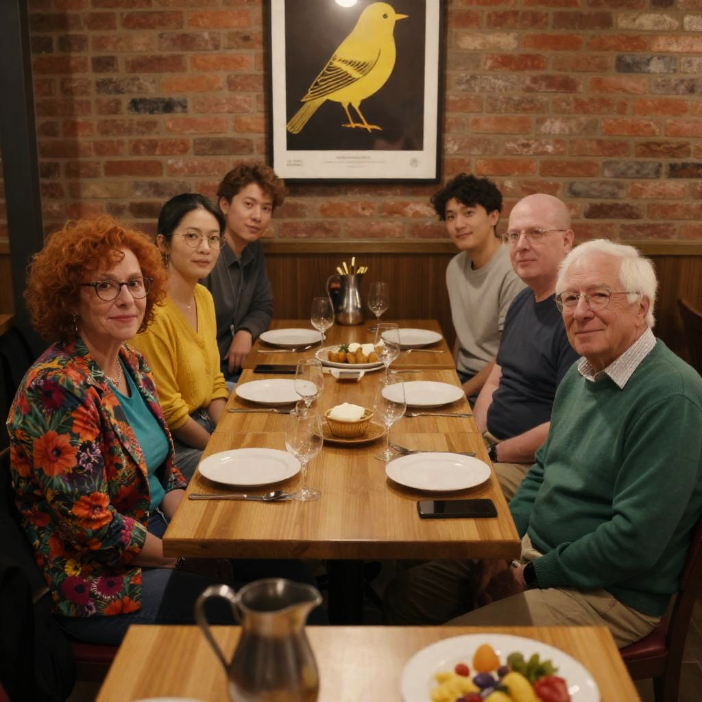 Group of seven people sitting around a wooden table in a cozy restaurant. Mixed genders and ages. Brick wall background. Various colorful clothing, glasses, plates, and utensils on the table. Poster of a yellow bird on the wall. Mild expressions, some smiling. Woman with curly red hair in floral jacket, elderly man with white hair in green sweater, others in casual attire. Warm lighting. Foreground has a silver pitcher and a plate of food on a nearby table.