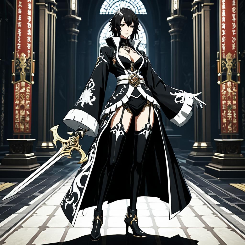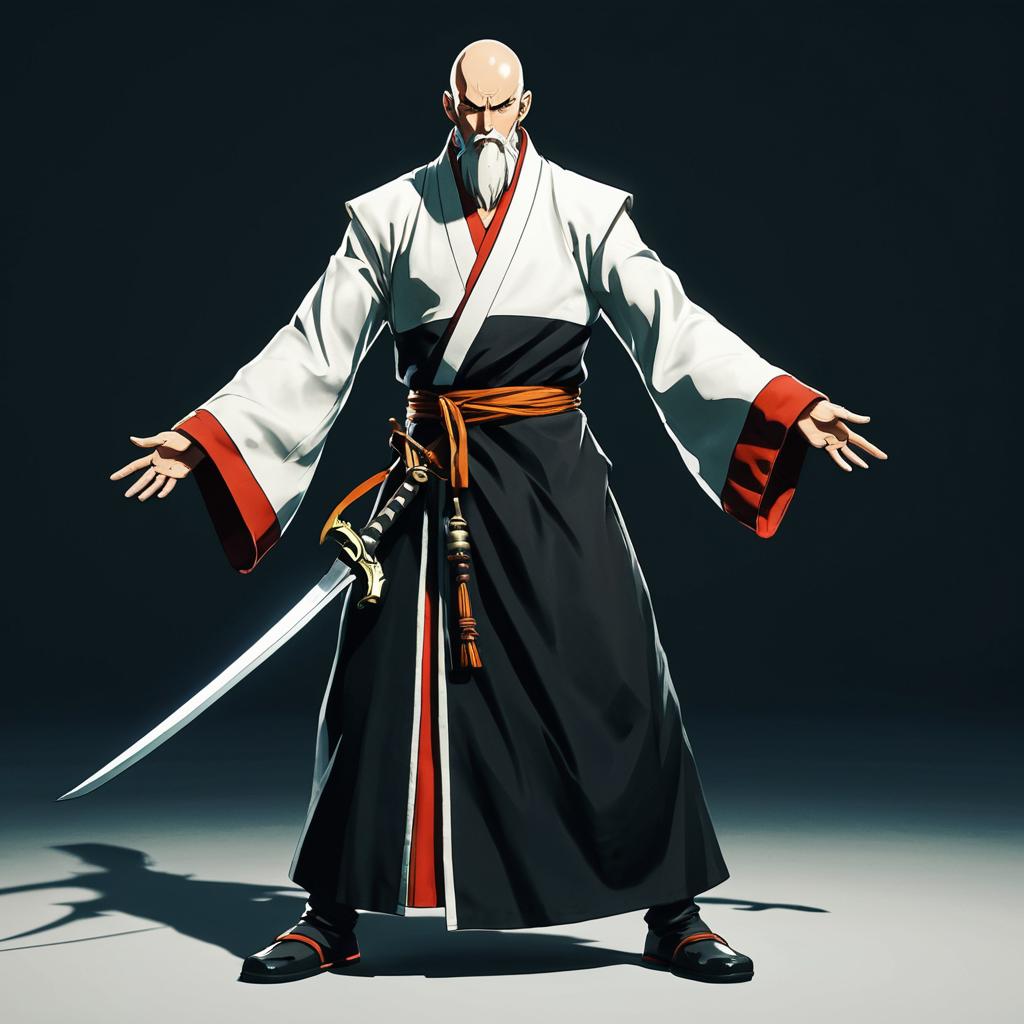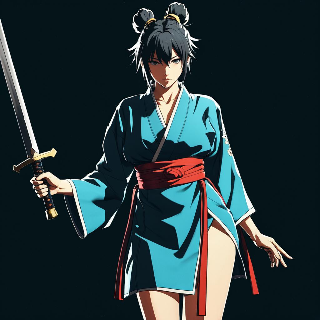 Ray Tracing animated character. anime warrior character with top knot hair for a fantasy hack and slash game. Guilty Gear, Stella Deus, Shigenori Soejima, Persona 5, Final Fantasy XV wearing a simple kimono robe. Long legs. Sassy pose. Contrasting colors.
