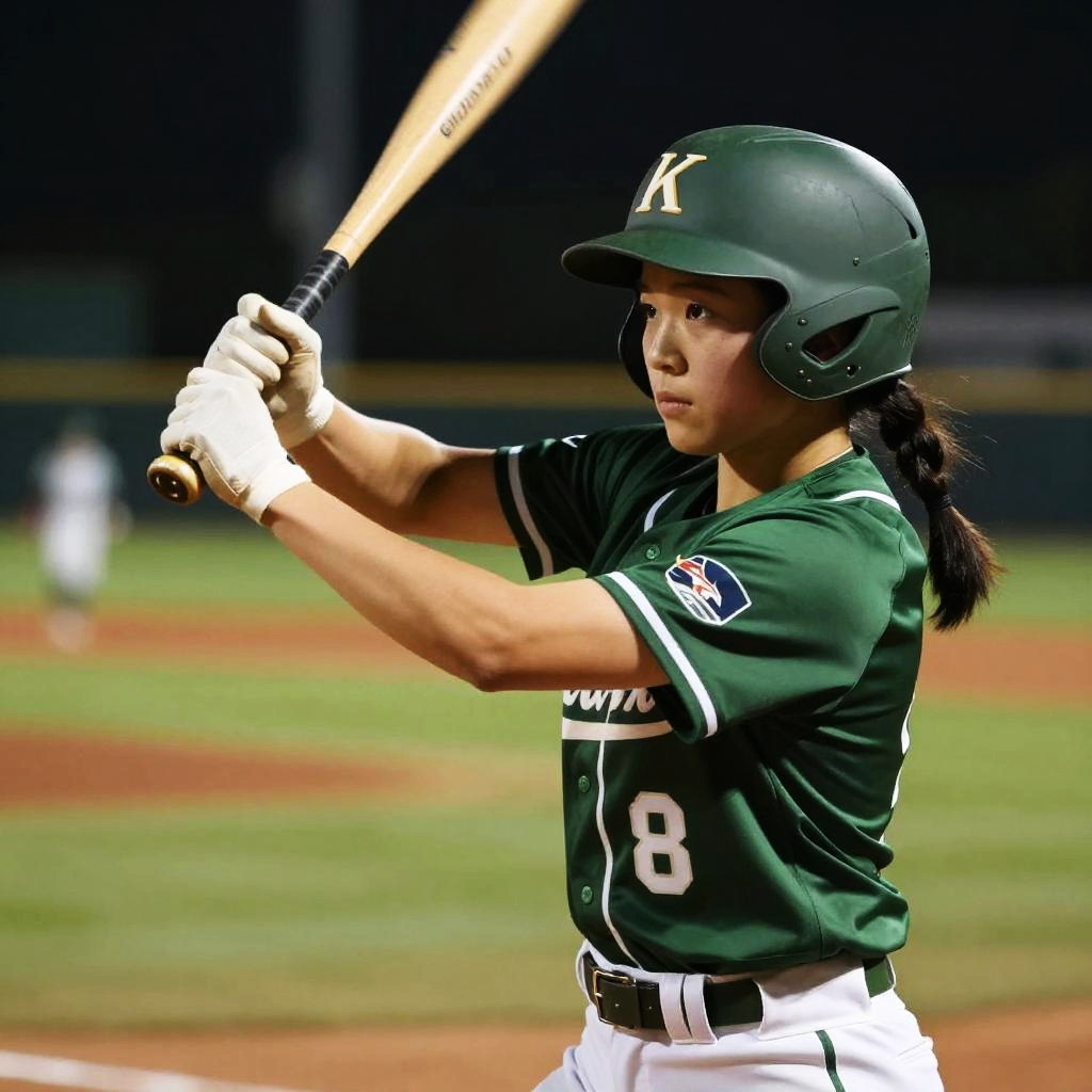 A woman playing baseball, (wearing baseball_uniform:1.3), green uniform, good hand, 4k, high-res, masterpiece, best quality, head:1.3, ((Hasselblad photography)), finely detailed skin, sharp focus, (cinematic lighting), night, soft lighting, dynamic angle, [:(detailed face:1.2):0.2], (((inside_stadium)))
