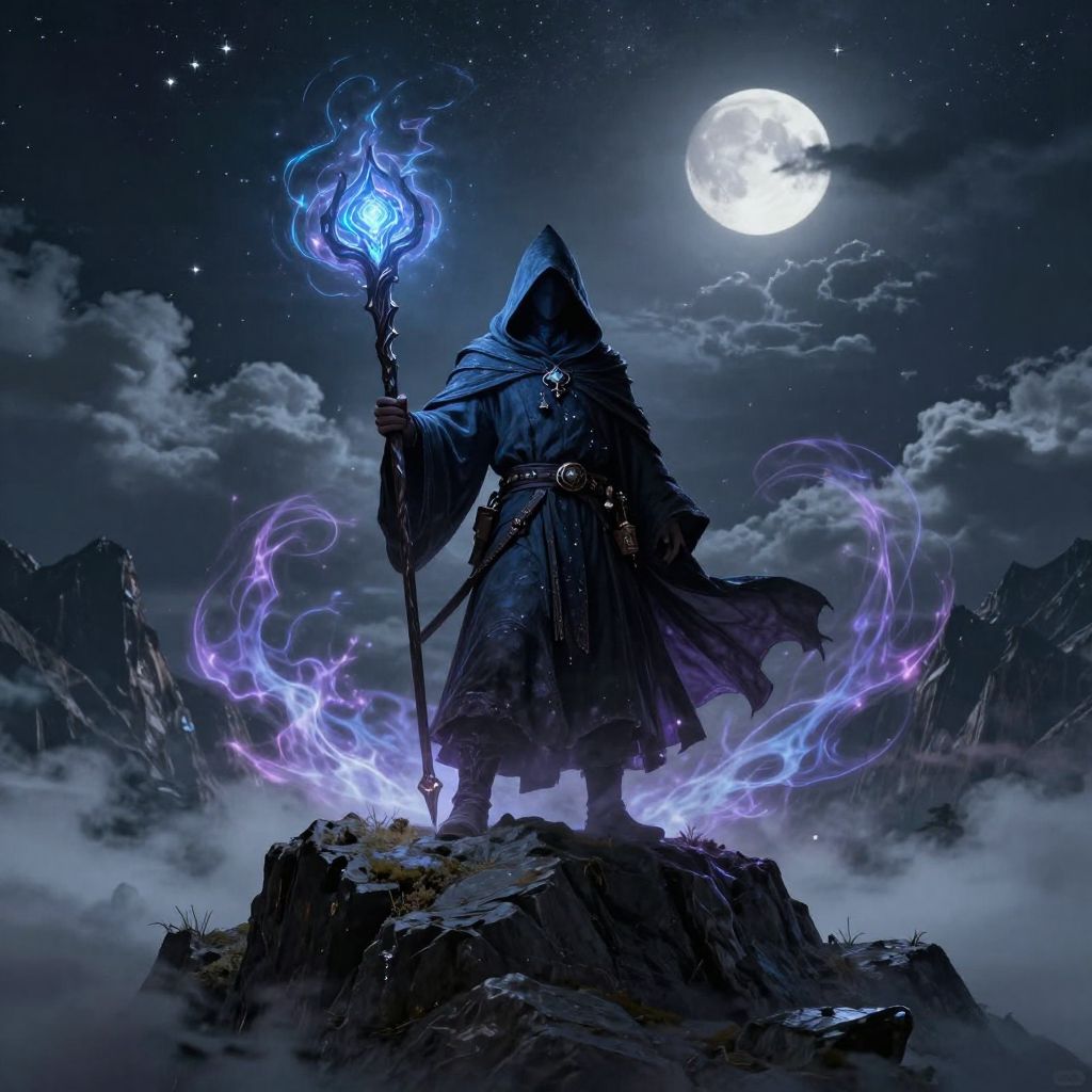 Wizard art dnd, a mysterious hooded wizard standing atop a mountain peak under a starry sky, staff glowing with ancient power, swirling magical energy around, epic fantasy landscape with dramatic clouds and moonlight, detailed and atmospheric digital art