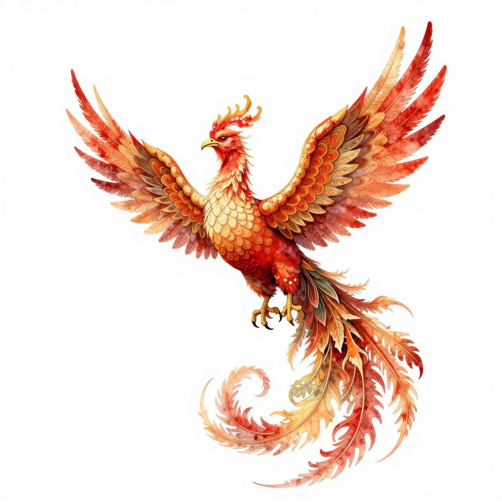 An exquisite illustration of Majestic phoenix rising, crafted in ornate watercolor brushwork with fiery red and amber highlights, set against a vast white negative space, UHD, 16K, ultra-detailed.
