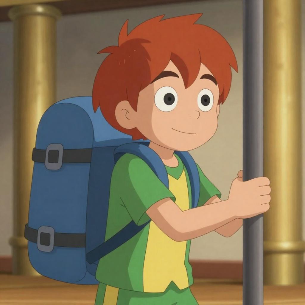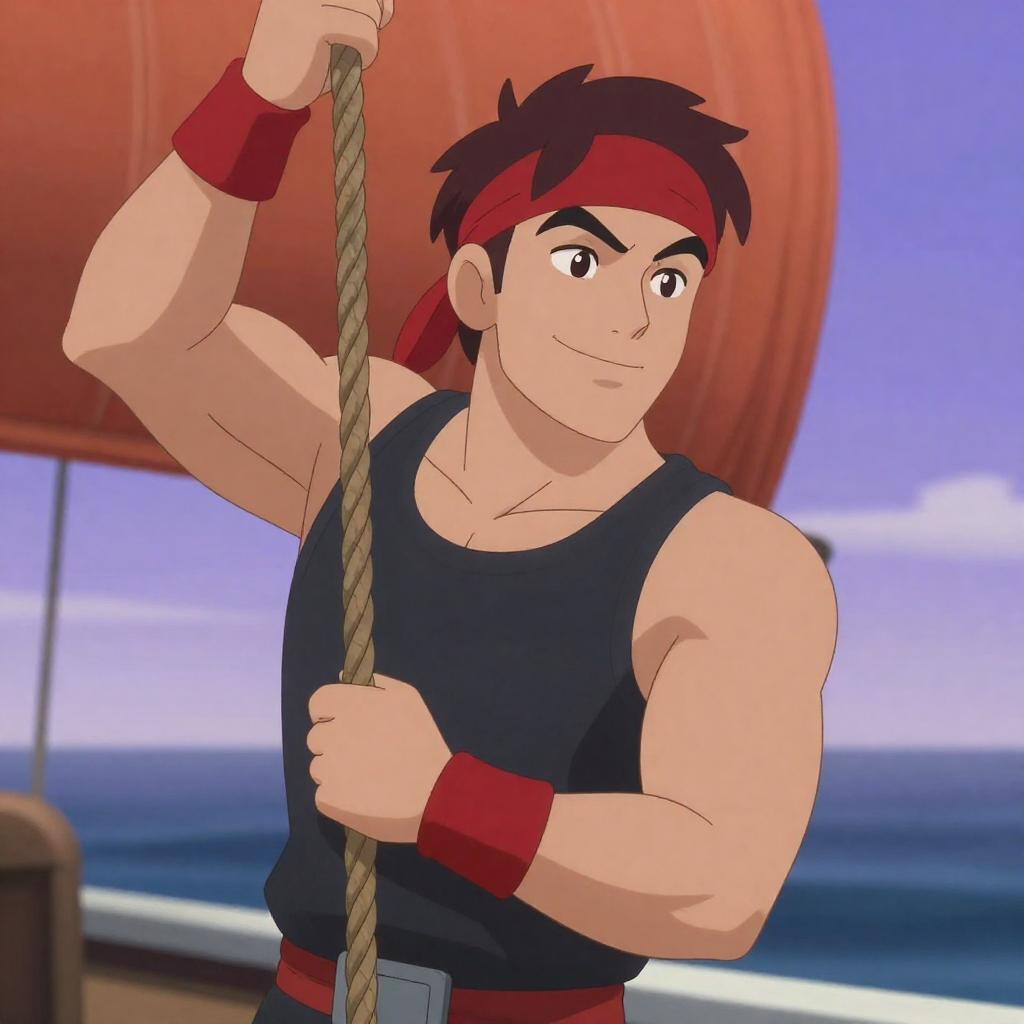 Animated muscular man wearing a red headband, black tank top, and red wristbands gripping a thick rope on a ship. The background features an orange ship sail, purple sky, and ocean. The man is smiling with his head turned to the right, his arm raised, depicting a confident and strong demeanor in a nautical setting.
