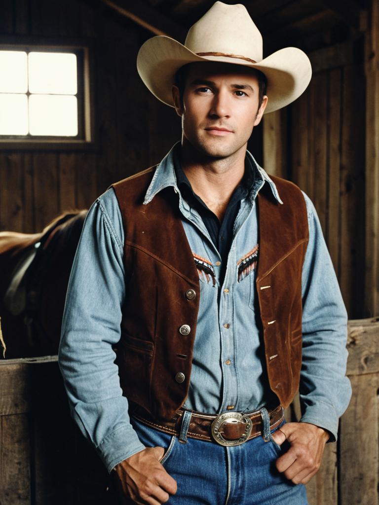 Man in Brokeback Mountain costume, waist-up photo in rustic barn setting, cinematic realism