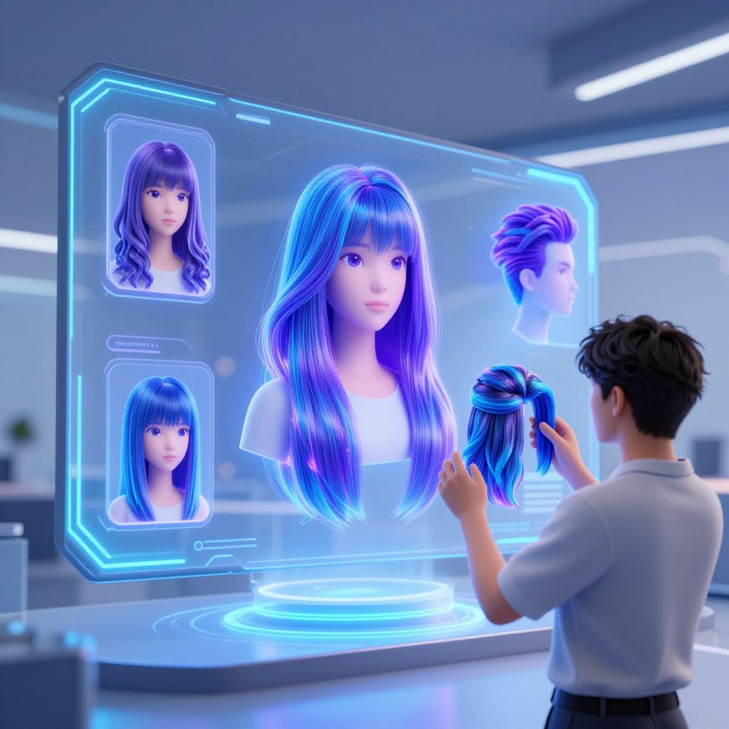 Futuristic hairstyle generator app in use on a holographic display, 3D hair modeling options floating in mid-air, neon blue and purple hues, sleek tech environment, young user experimenting with hairstyles, creative and dynamic composition