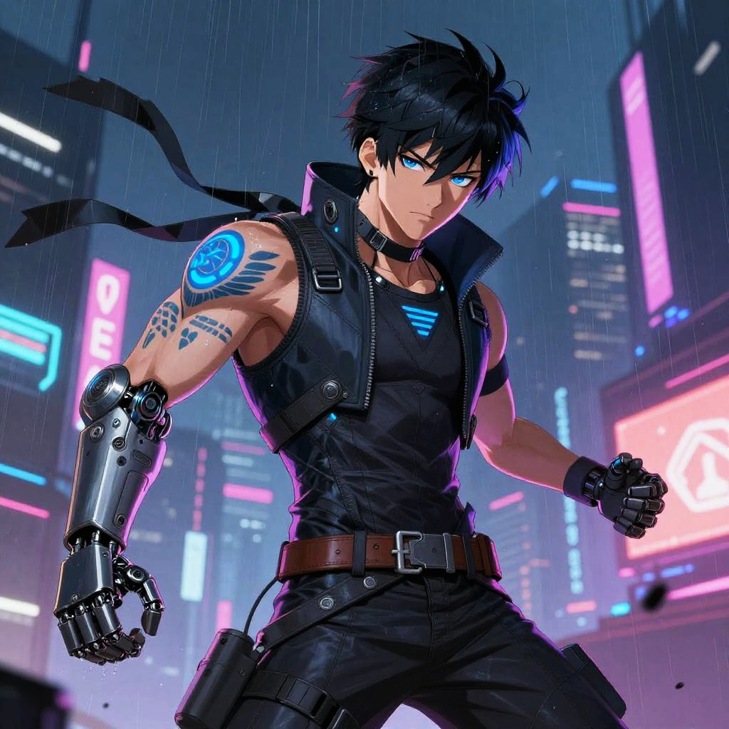 Dark haired anime guy in futuristic cyberpunk attire, glowing blue tattoos, robotic arm, vibrant neon cityscape background, rain and tech elements, sharp angular art style, action-ready pose, intense eyes.