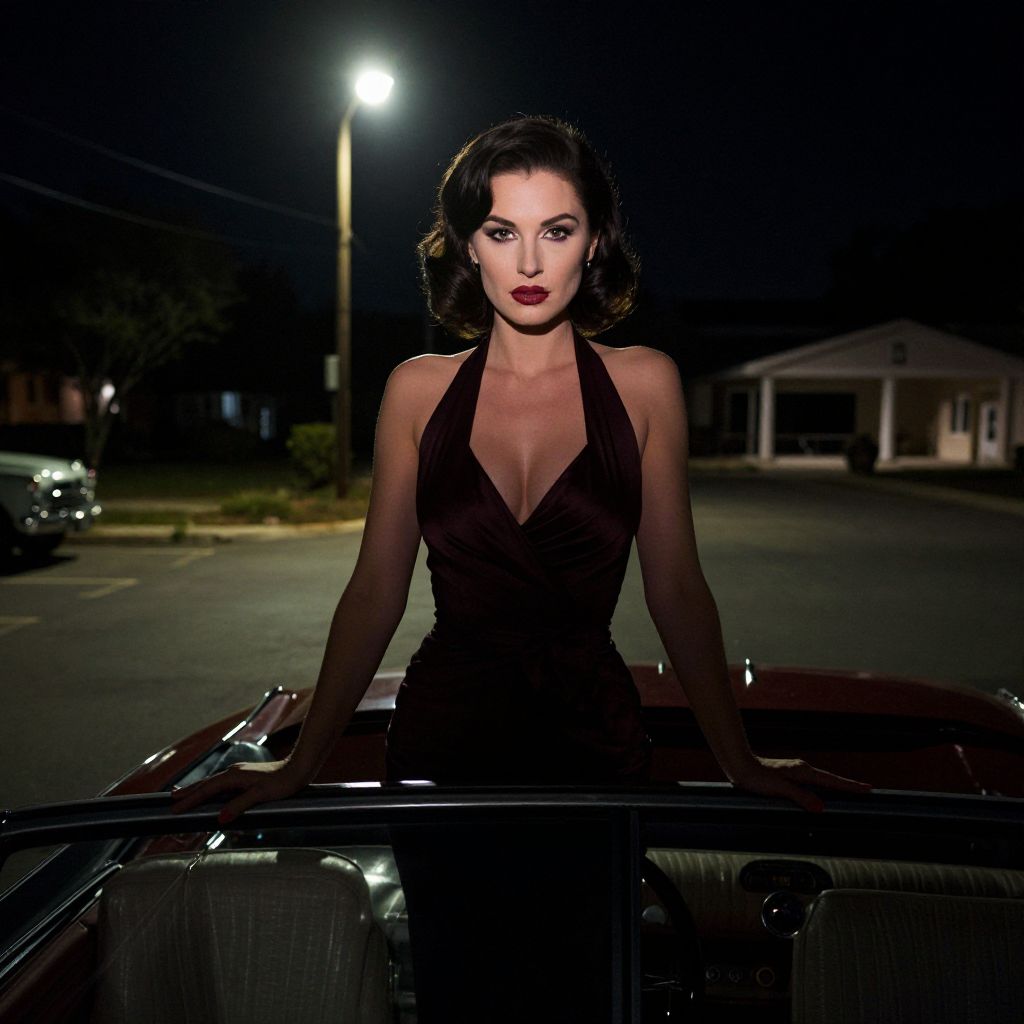 Photograph of a dark-haired, fair-skinned woman with dramatic makeup, standing confidently in a low-cut, black halter dress, leaning against the hood of a classic car at night. The background is dimly lit, showing a street with a lamp post, parked cars, and a single-story house. The car's chrome details and her dress's sheen are highlighted by the streetlight, creating a dramatic, noir-inspired atmosphere. The woman's intense gaze and poised stance exude a sense of mystery and allure.
