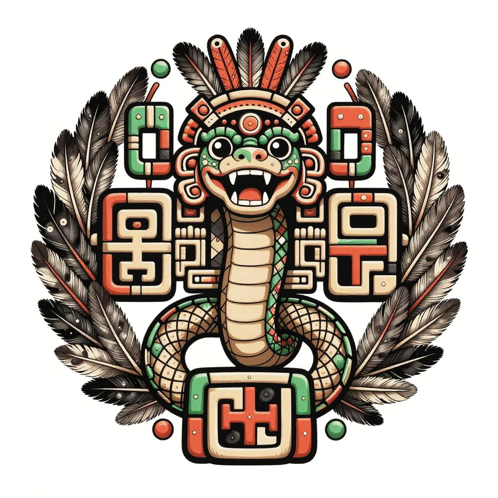 Digital artwork of a colorful, snake-like deity with a mask, feathers, and geometric patterns, set against a white background.