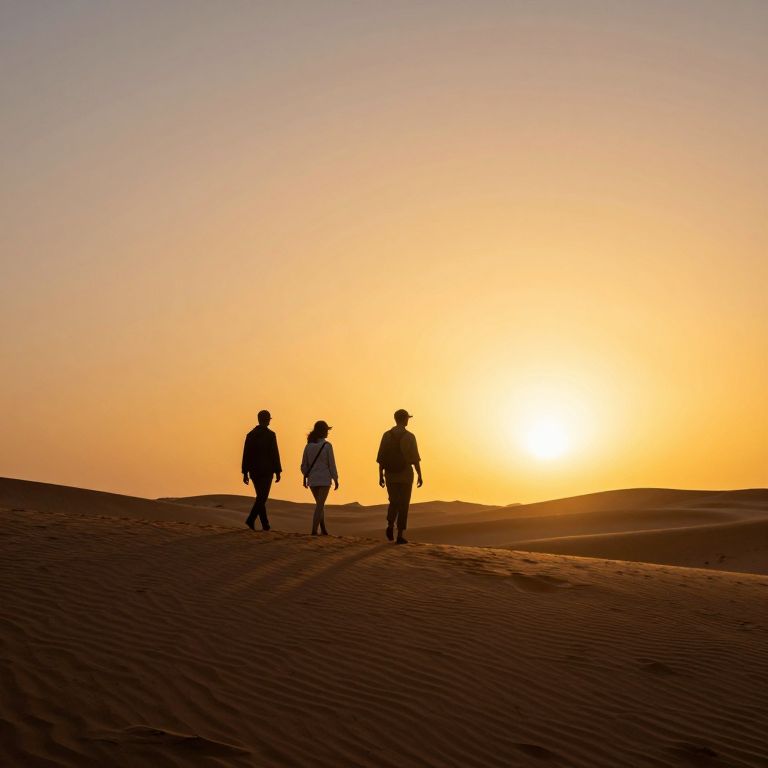 Silhouetted photograph of three people walking on a sandy desert at sunset, with a golden-orange sky and sun low on the horizon.