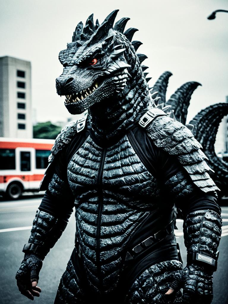 Man in Godzilla Costume, cinematic realism, action monster cosplay portrait
