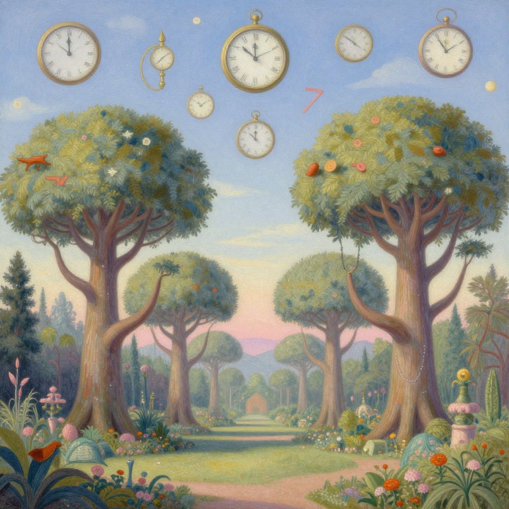 A surreal dreamscape emerges, featuring an imaginative blend of melting timepieces and impossible architecture. The cityscape stretches out below in a maze-like arrangement, with buildings folding upon themselves in intricate patterns, reminiscent of origami artistry. Metallic structures reflect the vivid hues of an abstract sky, casting a kaleidoscopic glow across the landscape. As you navigate this labyrinthine metropolis, each turn reveals another paradoxical wonder - streets looping back on themselves, bridges leading to nowhere, and clocks frozen yet ever-shifting. This enchanting world elicits a sense of childlike wonder combined with perplexity, inviting viewers to marvel at the marriage of logic and absurdity in a vibrant watercolor style.