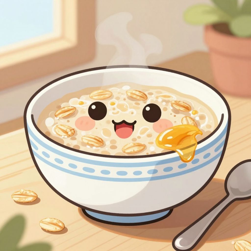 Porridge cartoon illustration, cheerful anthropomorphic bowl with oats and honey, bright morning light, vibrant colors, cute expressive face, whimsical and friendly style