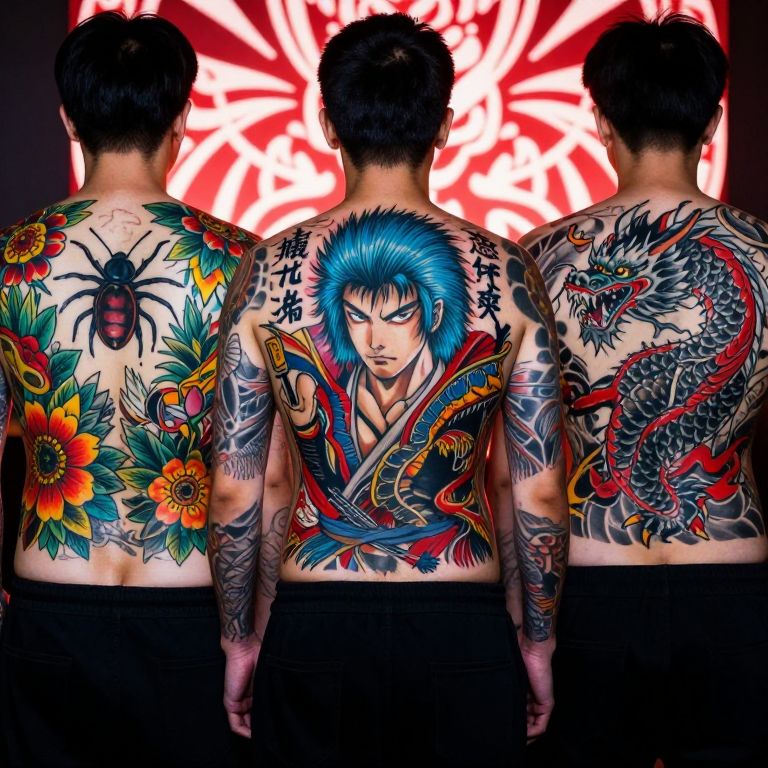 Photograph of three tattooed backs, showcasing vibrant and detailed tattoos. The leftmost person has a colorful floral and bug design, the middle person features a blue-haired samurai with Japanese text, and the rightmost person has a red and black dragon. The background has a glowing red and white pattern, adding a striking contrast. The tattoos are highly detailed and colorful.