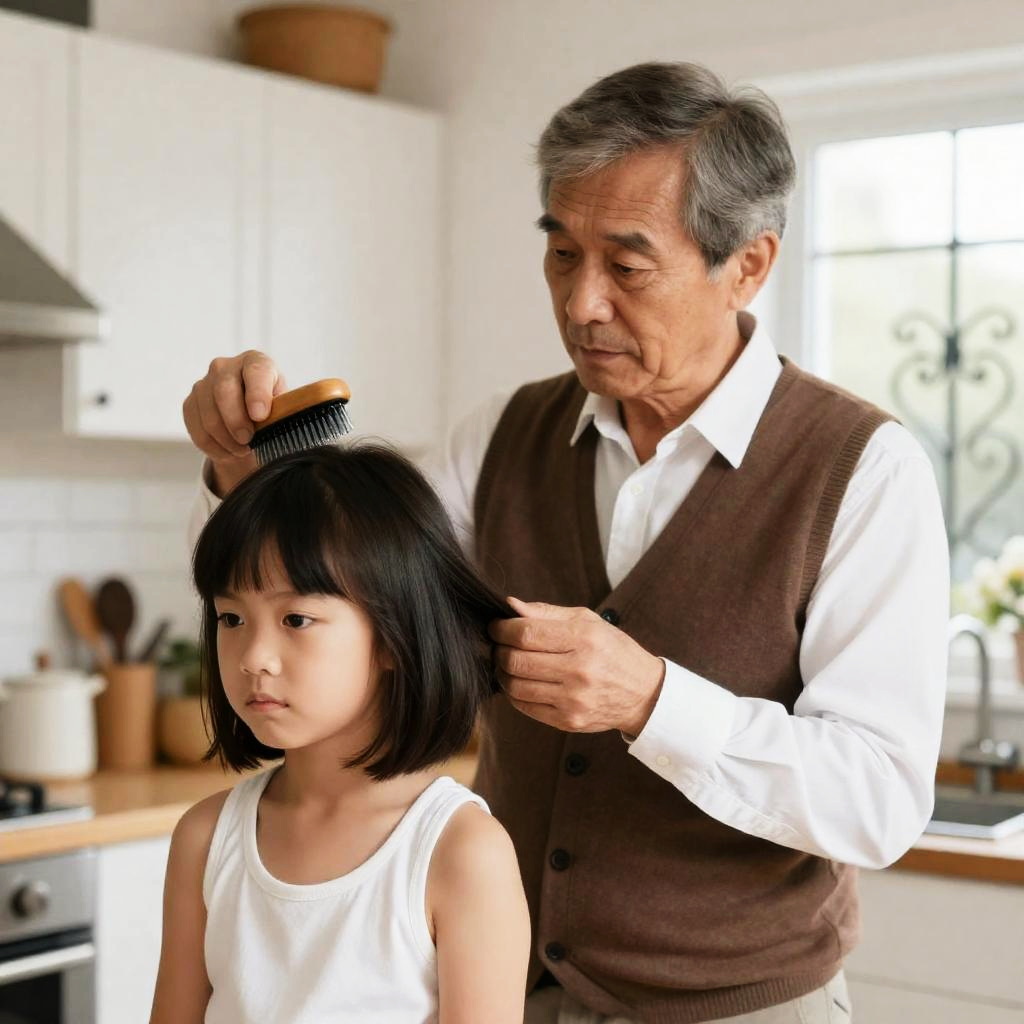 An older man with short brown hair and a white shirt with a brown vest, holding a young girl's hair with a brush, in a kitchen. She has short black hair and wears a white tank top. Background includes cabinets, kitchen items, and a window with a wrought iron design. The man looks serious, the girl looks unimpressed.