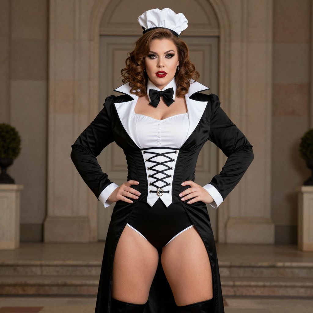 Photograph of a curvy, brunette woman in a sexy black and white French maid outfit with a lace-up front, revealing her thighs. She stands