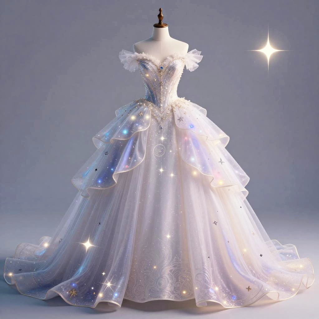 AI wedding dress generator crafting a whimsical fairy tale-inspired wedding dress with flowing layers and glowing celestial motifs, depicted in a dreamy digital art composition with soft pastel hues and intricate details.