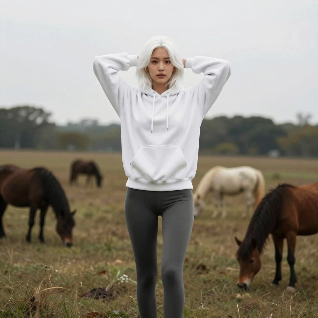 Masterpiece, best quality, (photorealistic:1.4), full body, (hoodie, leggins:1.1), landscape with animals, cinematic light, beautiful woman, arms behind head, skinny, large breasts, white hair, lob, detailed face