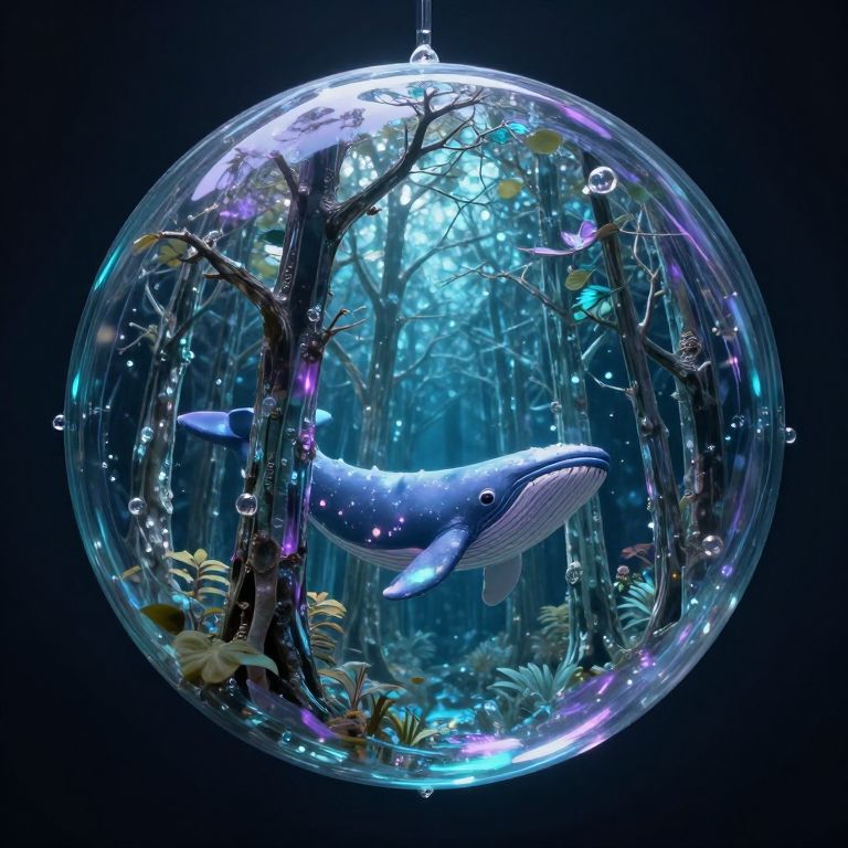 A forest made entirely of glass trees sways inside a suspended water droplet, sheltering tiny whales that sing in ultraviolet light.