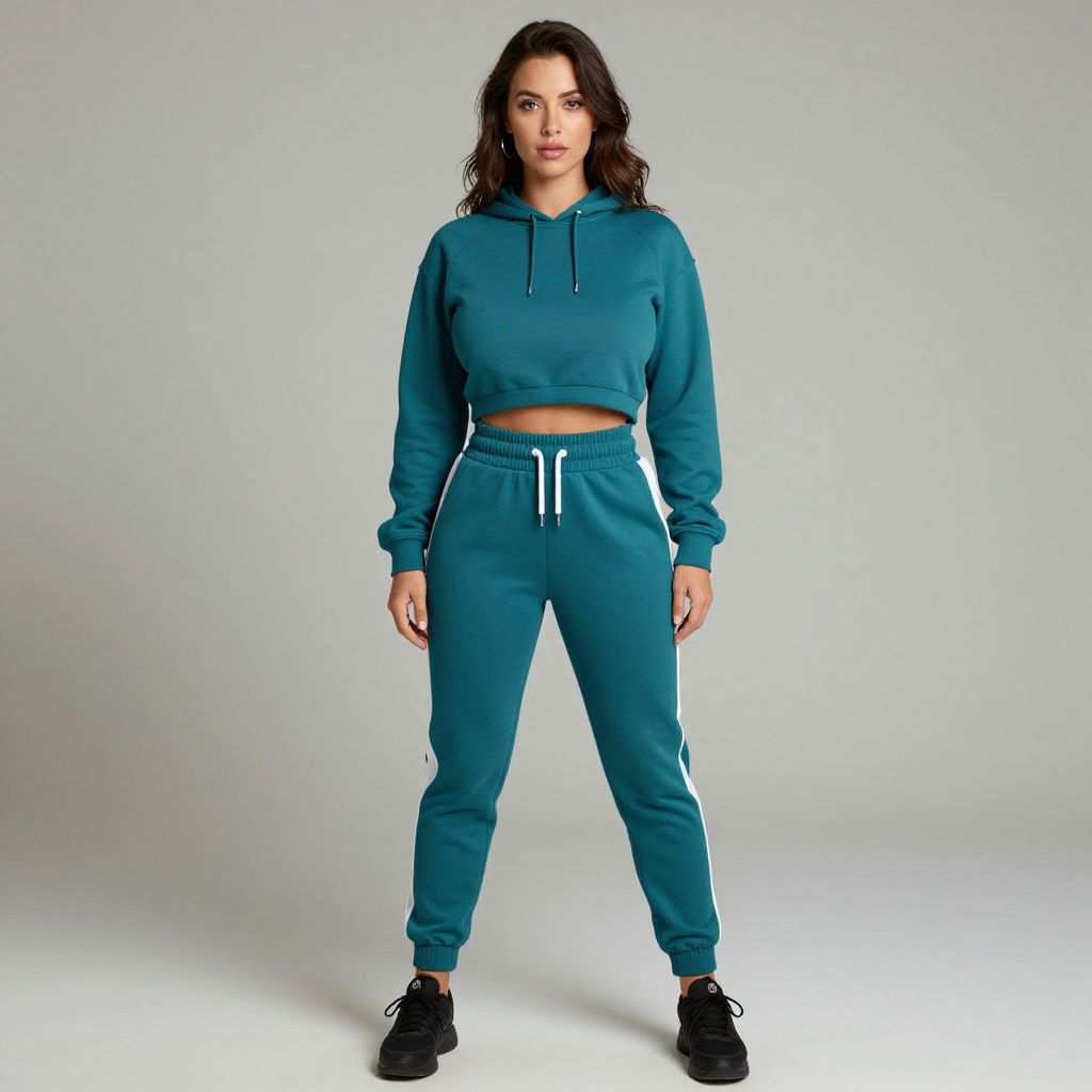"Woman, streetwear, cropped hoodie in teal with long sleeves and hood, high-waisted joggers in matching teal, white side stripes, drawstring waist, ribbed cuffs, black sneakers, studio background.. Sexy. Pretty face and beаutiful eyes. Big breasts."