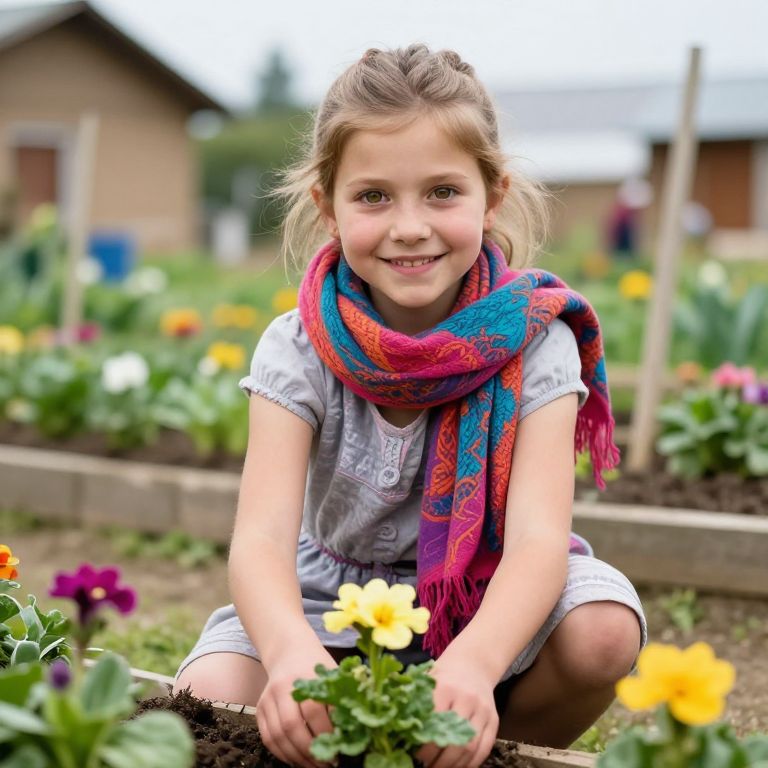 A sincere hero portrait of a young girl with bright hazel eyes and a warm smile, sitting by a community garden, wearing a colorful scarf and a simple dress, helping to plant flowers, embodying hope and compassion in a rural village setting.