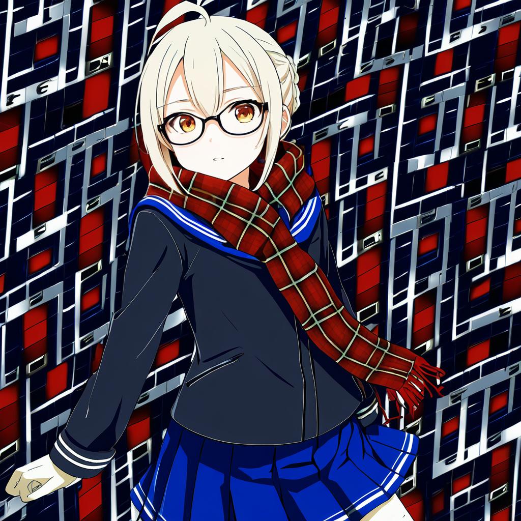 Digital anime-style drawing of a young girl with short, white hair and yellow eyes, wearing black-rimmed glasses. She is dressed in a black sailor-style school uniform with a blue collar and a pleated blue skirt. She also wears a red and black plaid scarf. The background features an abstract pattern of black and red squares with white lines, giving a dynamic and contrasting effect. The girl's expression is calm, and she stands slightly turned to the side, with her left arm partially visible. The overall style is vibrant and modern, with sharp lines and bold colors.