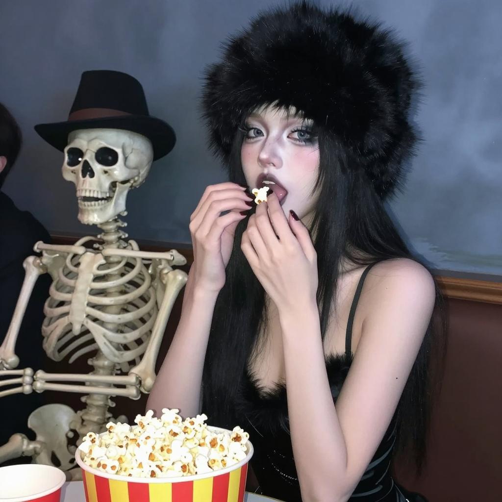Illustration of a woman with long black hair and pale skin, wearing a black fur hat and deep neckline dress, eating popcorn. A skeleton with a hat sits behind her. She has wide eyes and an open mouth. Blue smoky background. Woman's right hand holds popcorn, left hand touches mouth. Two people.