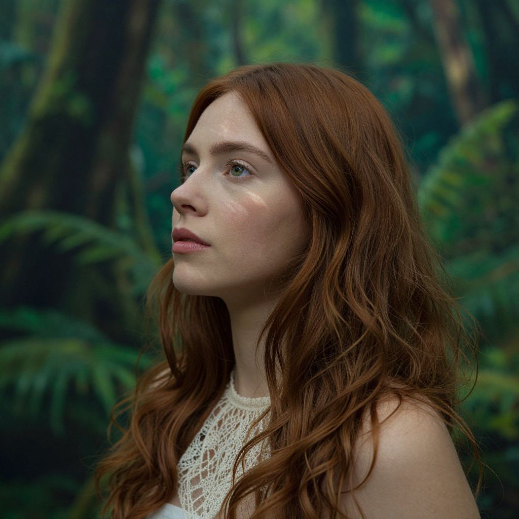 Photograph of a young Caucasian woman with long, wavy auburn hair and fair skin, standing in a dense, green forest. She wears a white, lace-patterned sleeveless top. Her blue eyes are gazing to the left, and a faint smudge of dirt is visible on her right cheek. The background is blurred, showing tall trees and ferns, creating a lush, natural setting. The lighting is soft, highlighting her delicate features and the texture of her hair and lace top. The overall mood is serene and introspective.