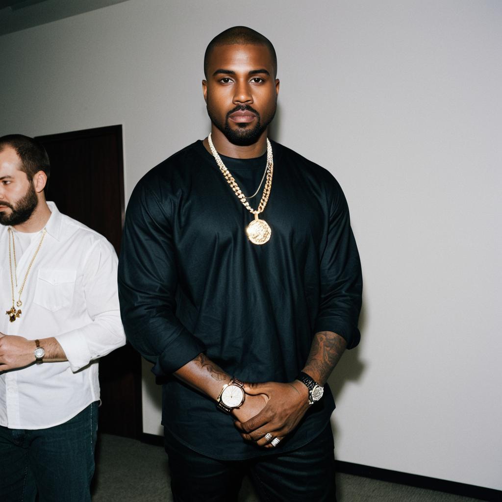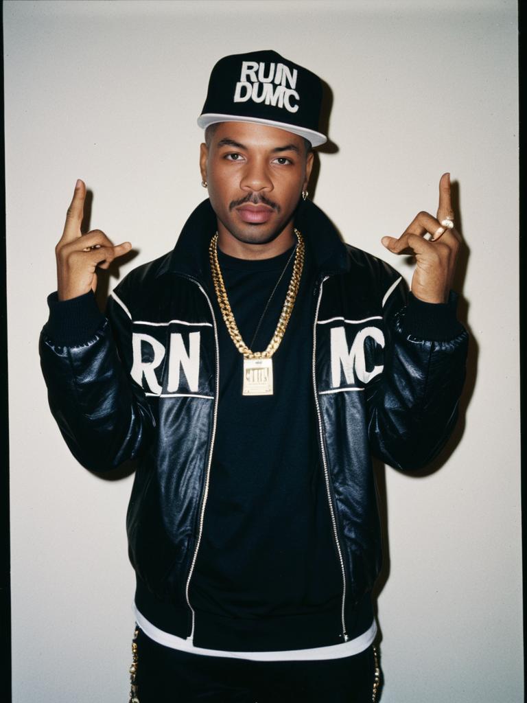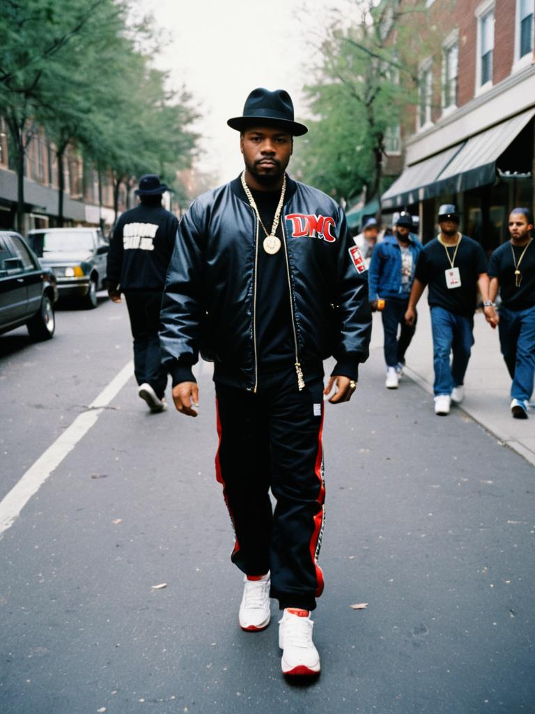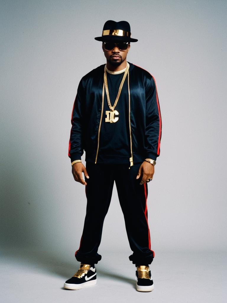 Full-body portrait of a man wearing a black Run DMC-inspired tracksuit with red stripes, accessorized with a large gold chain, black hat with gold band, sunglasses, and black and gold sneakers. The man stands against a plain gray background.