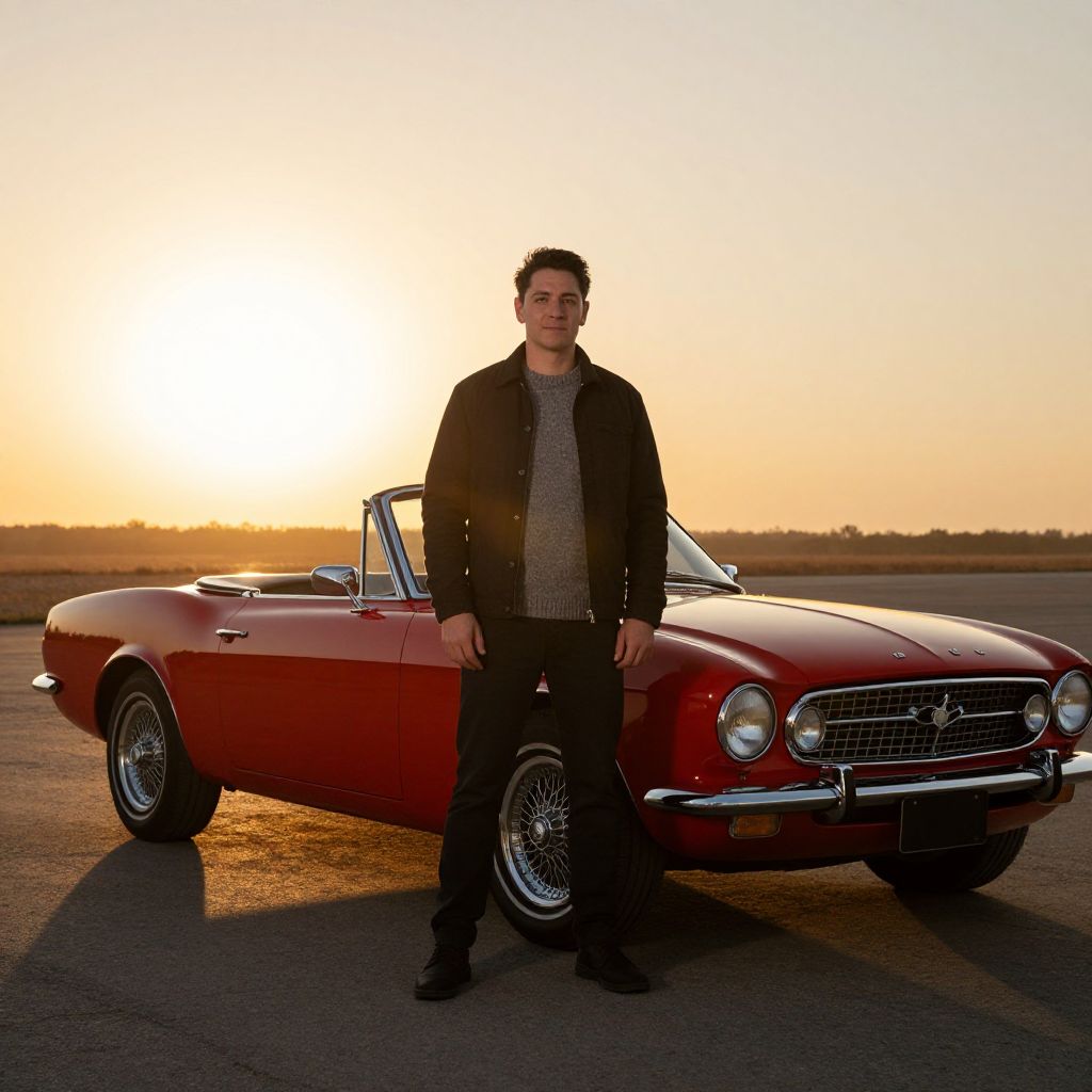 Photograph of a man standing in front of a red classic convertible car at sunset. The man has short, dark hair and is wearing a black jacket over a gray sweater and black pants. The sun is low in the sky, casting a warm, golden glow over the scene and creating long shadows. The background is an open, flat area with a clear, orange sky.