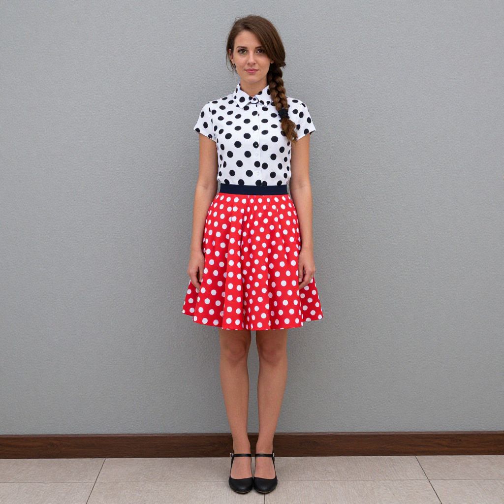 Poodle skirt costume, solo, 1girl, dress, realistic, brown hair, polka dot, polka dot dress, braid, full body, standing