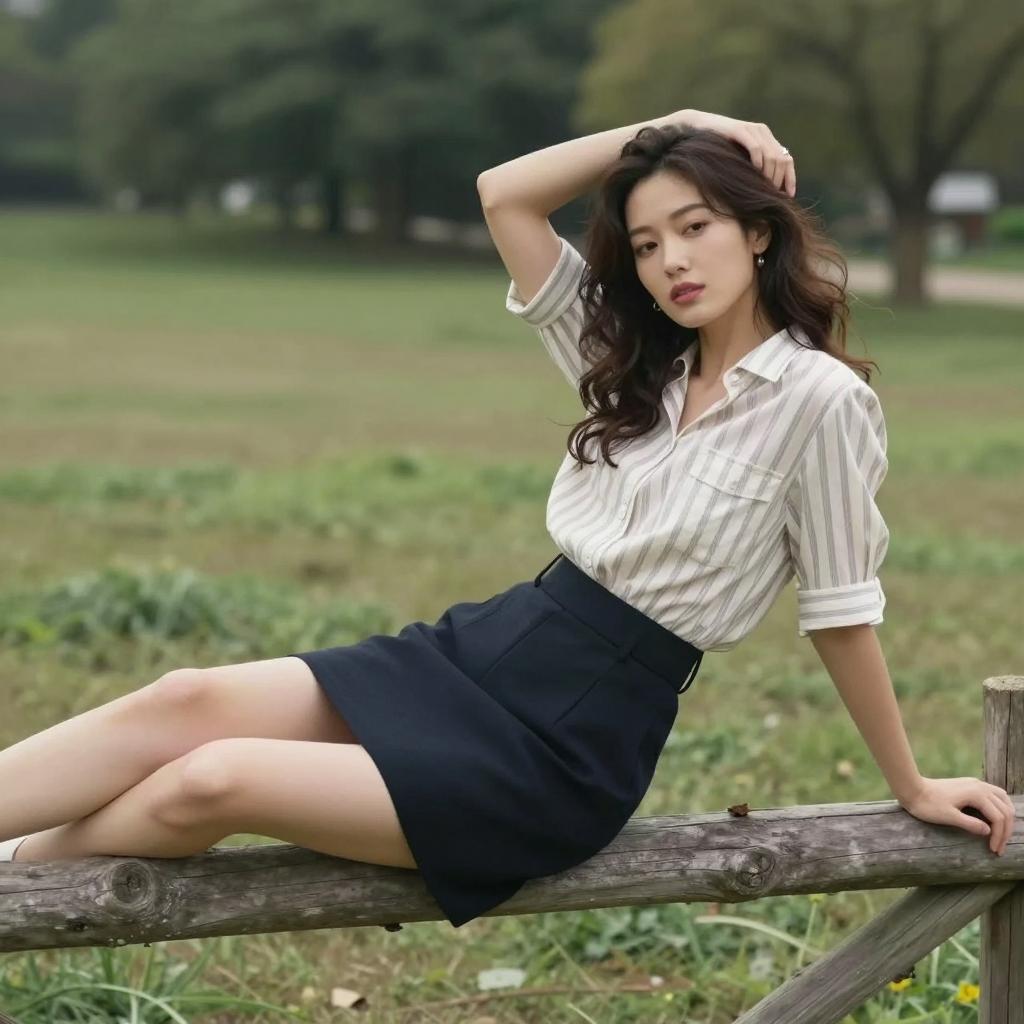 Woman with wavy hair, wearing striped blouse and dark skirt, leans on wooden fence. Right arm supports head, left arm rests on fence. Background: grassy field with trees. Woman's expression is relaxed. Partially visible person's leg in foreground. Woman's legs are crossed, lying on fence.
