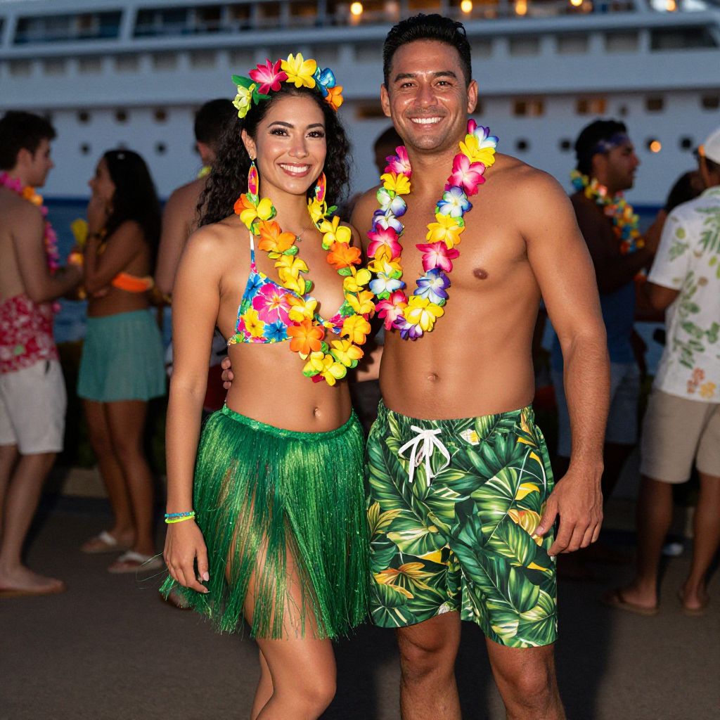 Tropical Cruise Couple donning vibrant Hawaiian-themed costumes, featuring a woman in a floral bikini top paired with a green grass skirt and flower accessories, alongside a man in matching leaf-patterned swim shorts and a floral lei, perfect for a festive luau or international party event.