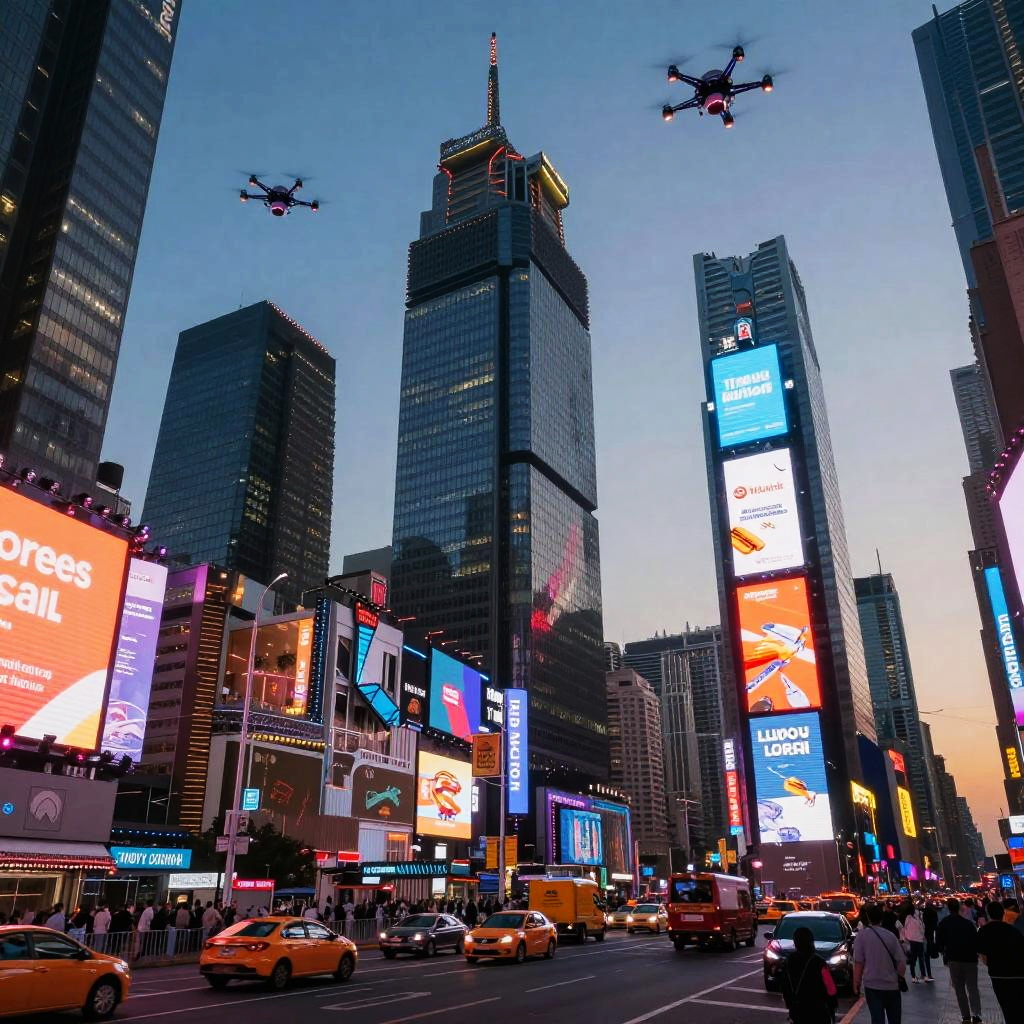 Photograph of a bustling New York City street at dusk, featuring towering skyscrapers adorned with vibrant, colorful digital billboards. Two drones hover in the blue sky. Bright yellow taxis and pedestrians fill the street below. The billboards display various advertisements in neon hues, including orange, blue, and white. The buildings have reflective glass windows, capturing the city lights. The scene is dynamic, with a mix of modern architecture and lively urban energy, capturing the essence of Times Square.