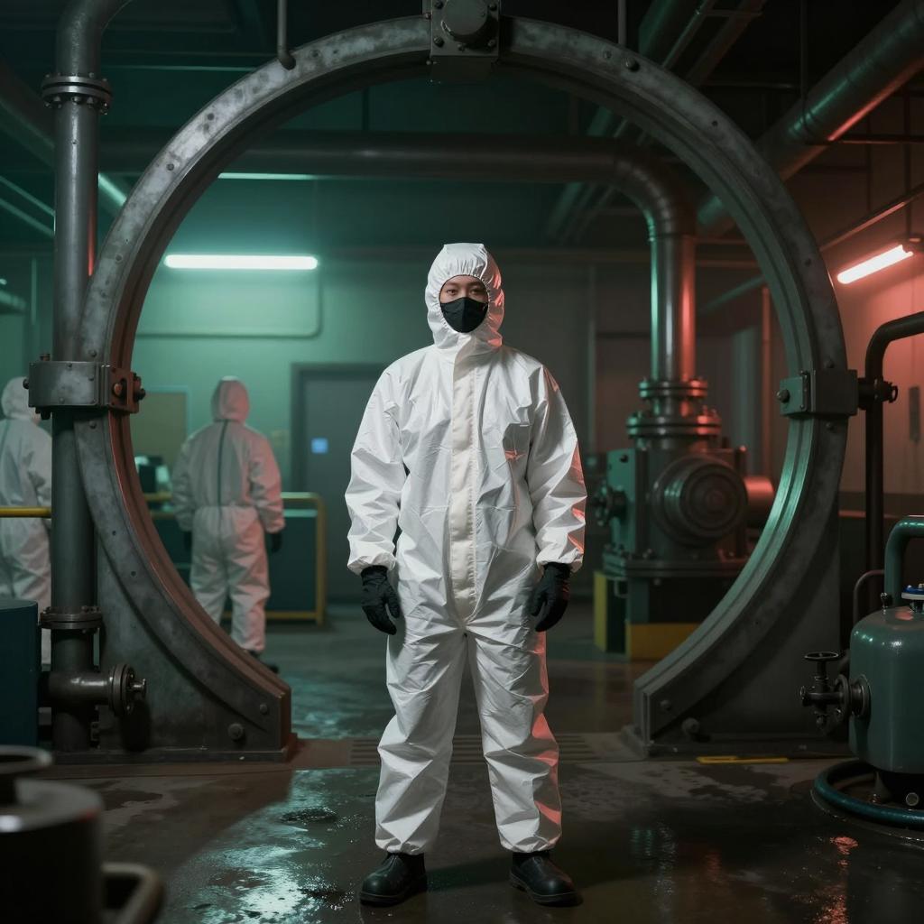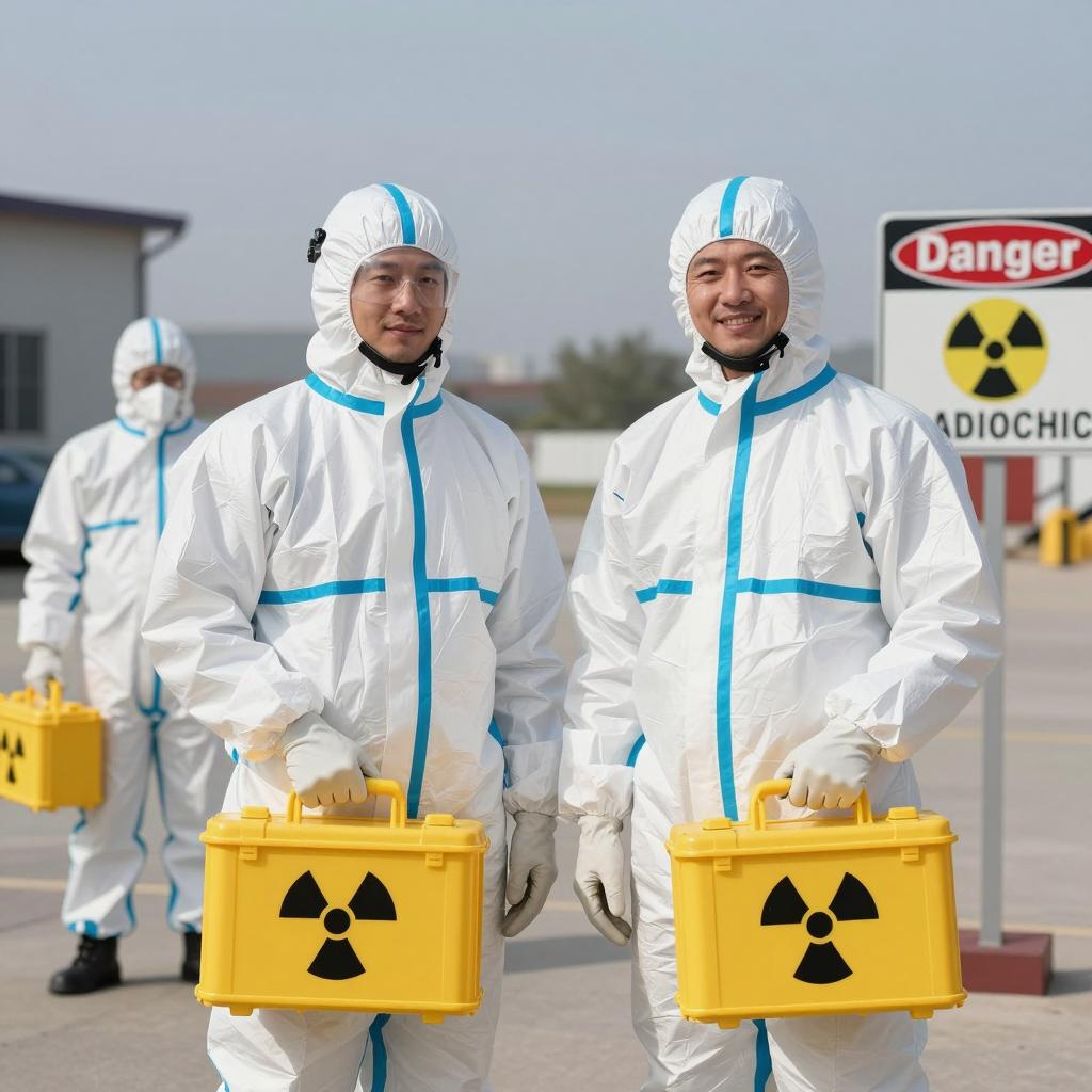 Two male workers in white hazmat suits, helmets, and gloves, holding yellow radiation warning boxes. Both men have light skin and are smiling. Another worker in the background also wears a hazmat suit. One man holds a radiation symbol. A "Danger Radioactive" sign is visible in the background. The setting is outdoors with a clear sky and some industrial elements.