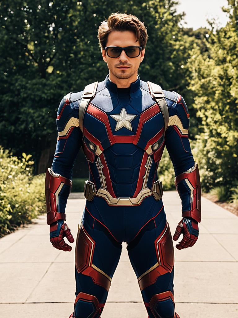 A young man wearing an Avengers quantum suit bodysuit in navy blue, red, and gold colors, standing outdoors on a sunny day. He has brown hair styled back and is wearing sunglasses. The superhero costume features a prominent star emblem on the chest and armored details on the arms and legs. The background includes green trees and a paved walkway.