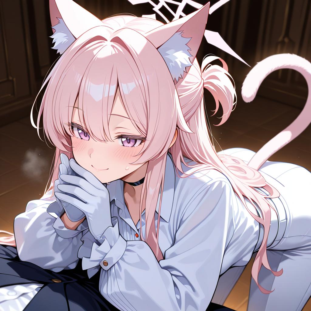 Akira (blue archive), blue archive, 1girl, cat girl, cat ears, animal ear fluff, cat tail, red eyes, hair between eyes, colored eyelashes, long hair, white hair, pink hair, white shirt, white gloves, white pants, halo, pink halo, long sleeves, black choker, by artist kienbiu, illustrious