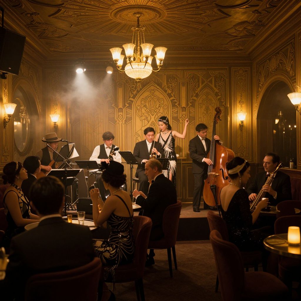 1930 aesthetic, elegant jazz club interior with musicians playing on stage, patrons in flapper dresses and suits, warm golden lighting, intricate art deco patterns on walls and ceiling, smoke filling the room for a nostalgic, moody ambiance