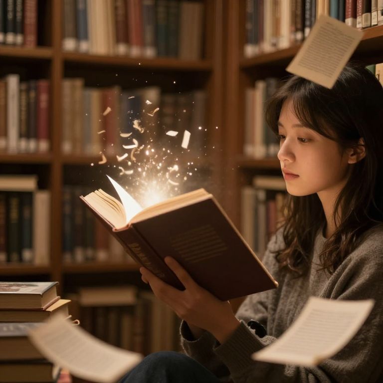 Photograph of an Asian woman with long dark hair, wearing a gray sweater, sitting in a dimly lit library with wooden bookshelves filled with books in the background. She is intently reading a book, from which bright magical sparks are emanating, floating papers surround her. The image has a warm, mystical tone with soft, focused lighting highlighting her focused expression. The book's pages are slightly glowing, adding a magical, enchanted feel to the scene.