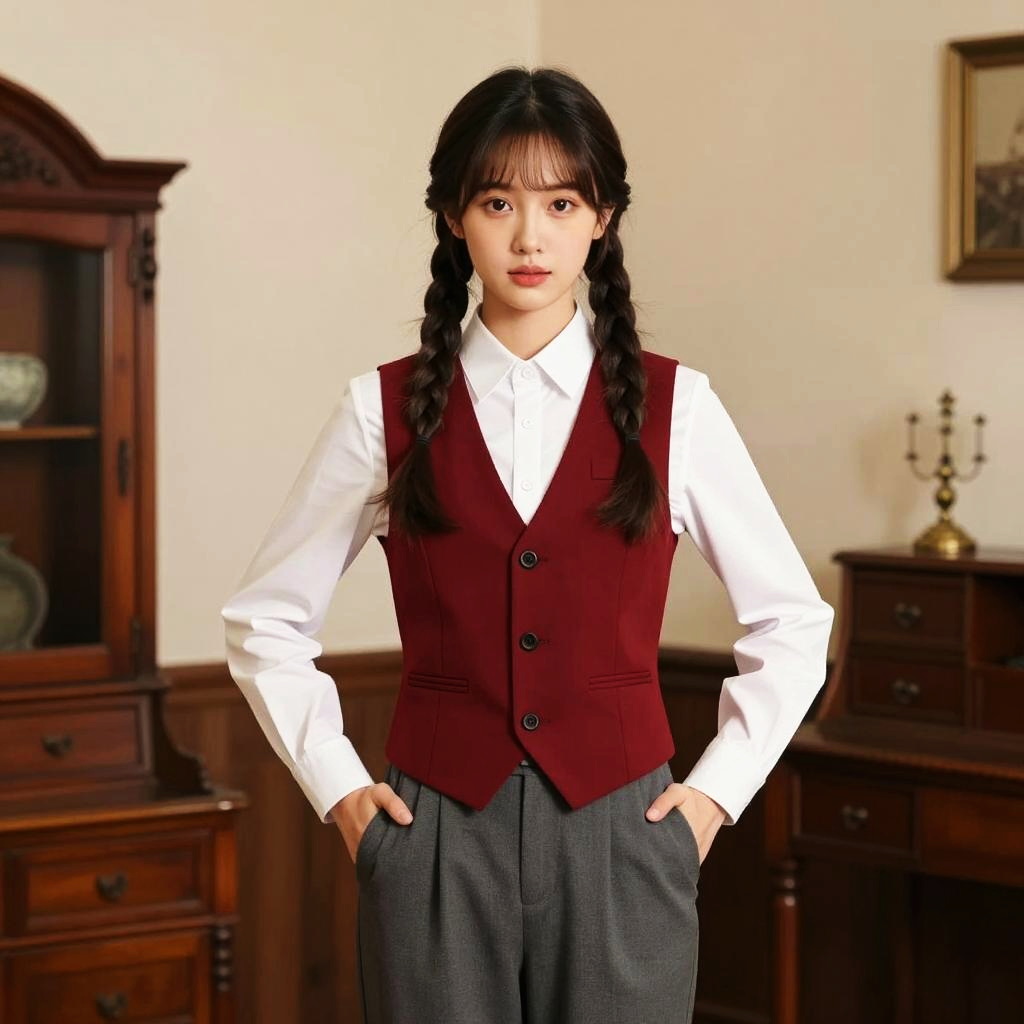 A young woman stands confidently in a classic interior setting, wearing a white shirt paired with a red vest and gray trousers. Her hair is styled in two neat braids, complemented by a vintage-inspired look enhanced by antique wooden furniture and warm lighting in the background.