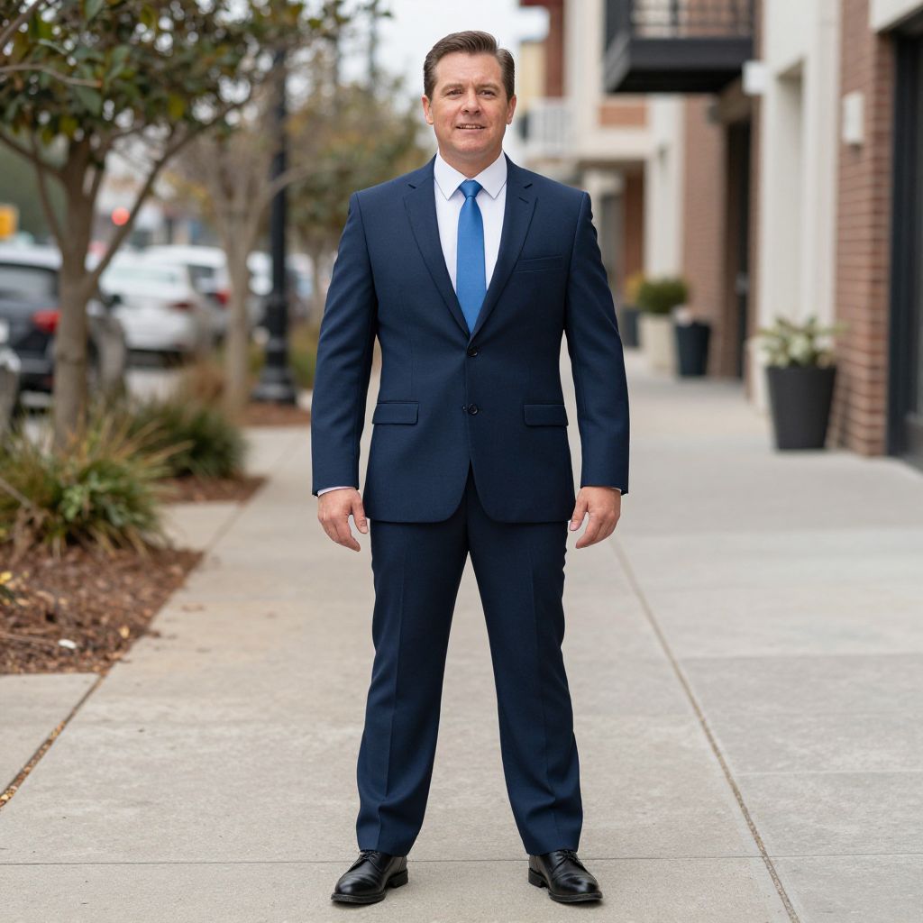 Photograph of a middle-aged Caucasian man standing on a sidewalk. He has short brown hair, a mustache, and is wearing a dark navy blue suit with a white dress shirt and a light blue tie. His black leather shoes are polished. The background shows a suburban street with blurred cars, bushes, and brick buildings. The sidewalk is light gray, and the man is centered in the image, facing the camera with a neutral expression. The lighting is natural daylight, highlighting his formal attire.