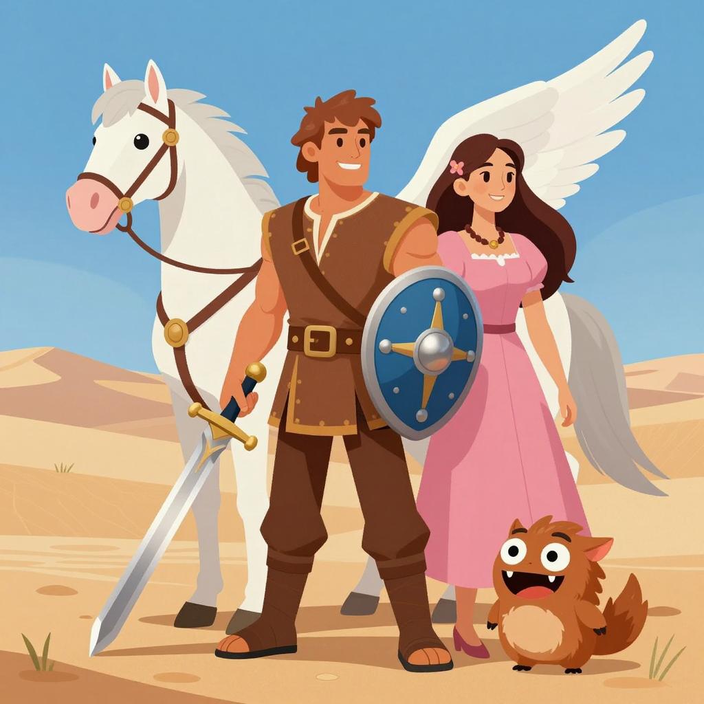 Digital illustration of a fantasy scene. A muscular man with brown hair, wearing a brown tunic and sandals, holds a sword and shield. A woman with long brown hair, in a pink dress, stands beside him. A white winged horse stands behind them. A small, laughing, brown creature with large eyes crouches at their feet. Background includes golden sand dunes and blue sky. The man and woman smile, while the creature has a wide grin.