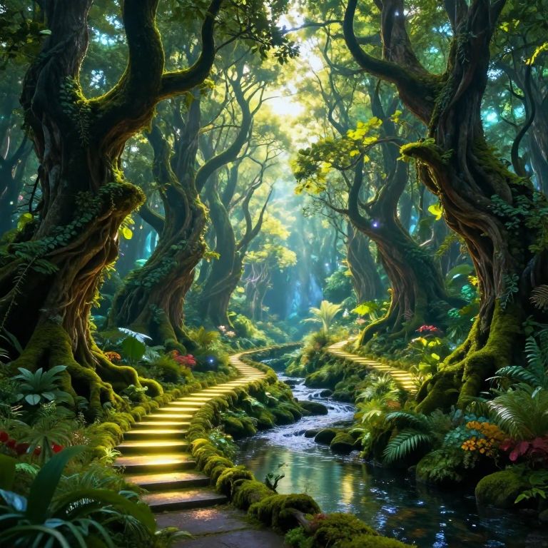 Frutopia enchanted forest, giant fruits hanging from lush trees, crystal clear river reflecting multicolored fruit skins, mystical creatures shaped like fruits roaming peacefully, morning mist with soft light rays piercing through canopy, vivid and magical ambiance.