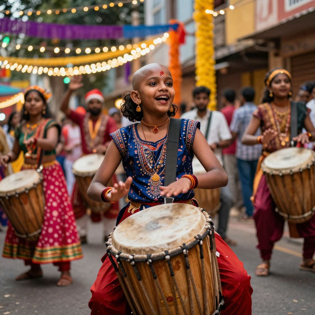 Dynamic street scene featuring a bald Indian girl playing traditional drums passionately during a vibrant cultural festival, bright colorful decorations, dancers in festive attire, sparkling fairy lights, intense movement captured with dramatic focus on her joyful expression.