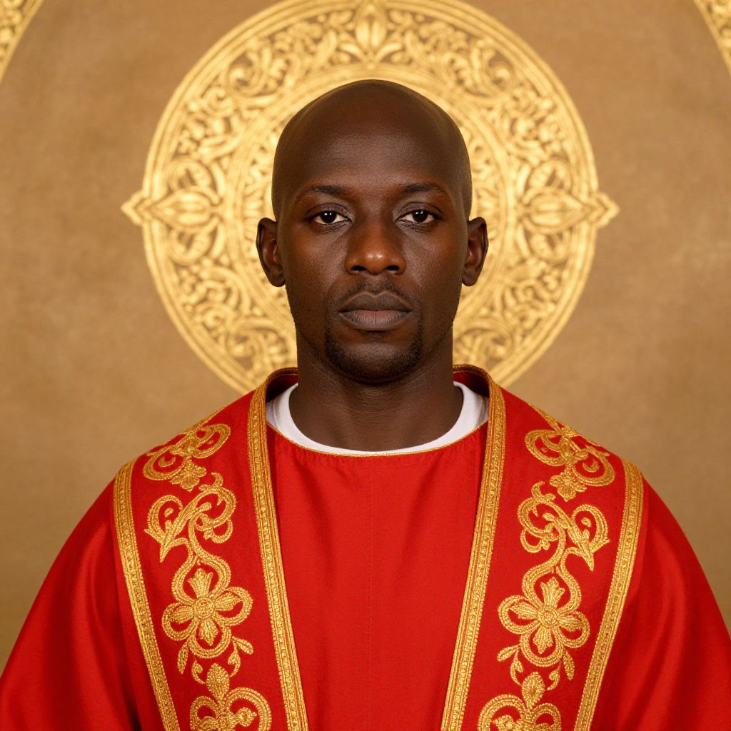 A symmetric portrait featuring a dark-skinned, bald man resembling a saint, dressed in a vibrant red garment with an intricate golden halo motif in the background.