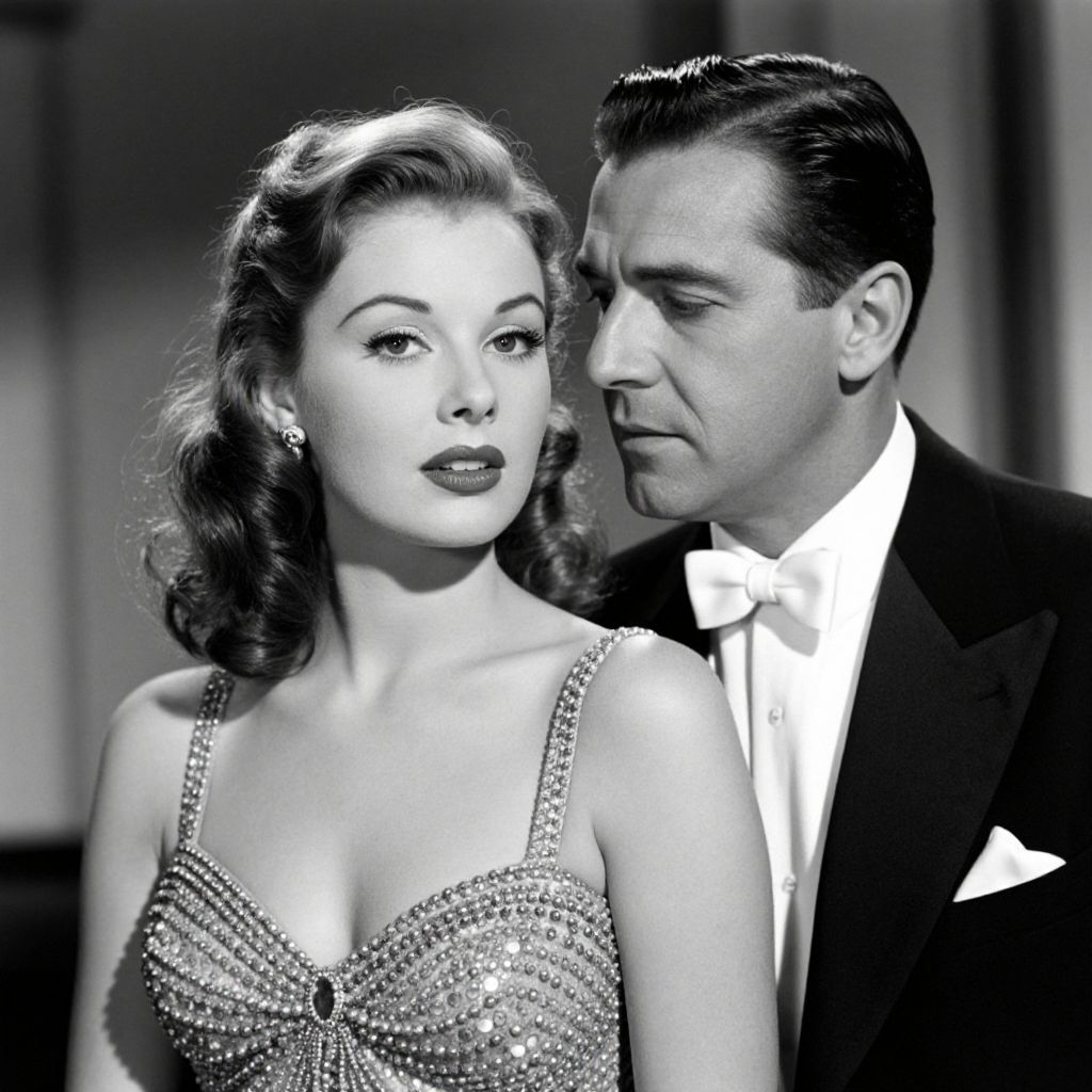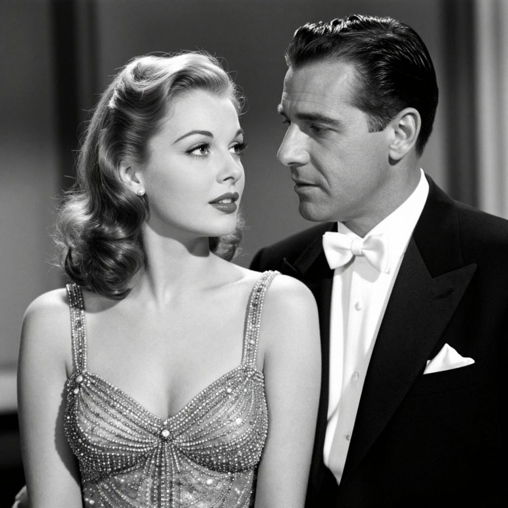 A black-and-white film still featuring a glamorous woman in a beaded dress and a man in a classic tuxedo, evoking a vintage Hollywood aesthetic with dramatic lighting and high-definition detail reminiscent of mid-20th-century cinema.