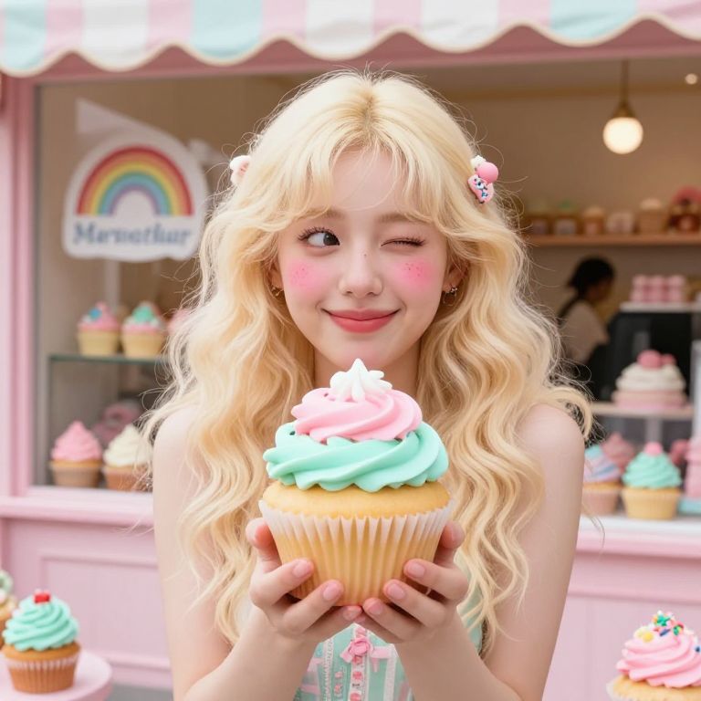 Photograph of a young, fair-skinned girl with long, wavy blonde hair adorned with pink hairpins, winking and smiling at the camera. She holds a cupcake topped with swirls of pink and blue frosting in her hands. She wears a light-colored, sleeveless top. In the background, a pastel pink cupcake shop with a rainbow sign and shelves of cupcakes are visible. The shop has a scalloped, white awning. The image has a slight, vibrant, and exaggerated digital filter, enhancing colors and textures.