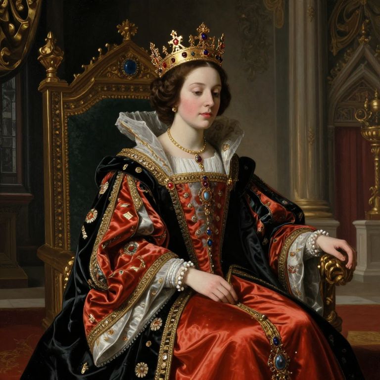 Renaissance-style portrait of a fair-skinned queen with brown curls, wearing a gold crown, red and black satin gown with gold embroidery, seated
