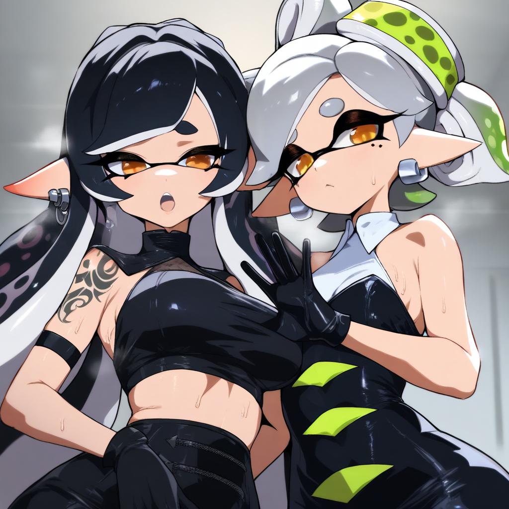 Swf, SFW, marie_splatoon, multiple girls, 2girls, cousins, gloves, tentacle hair, tattoo, earrings, pointy ears, jewelry, open mouth, grey hair, sweat, black gloves, black hair, mole under eye, mole
