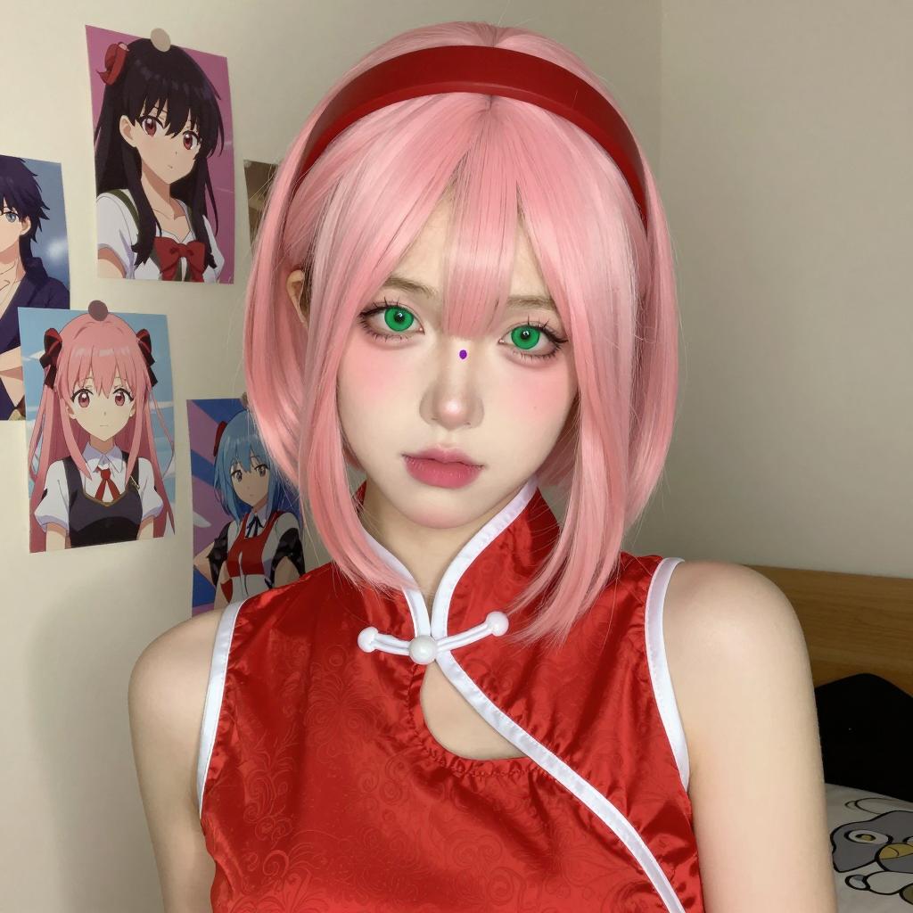Young woman with pale skin, pink bob haircut, green eyes, and pink lipstick, wearing a red Chinese-style sleeveless dress with white trim. Red headband, small purple mark on forehead. Background has anime posters on a beige wall. She looks directly at the camera with a neutral expression. Upper body visible. Bedroom setting.