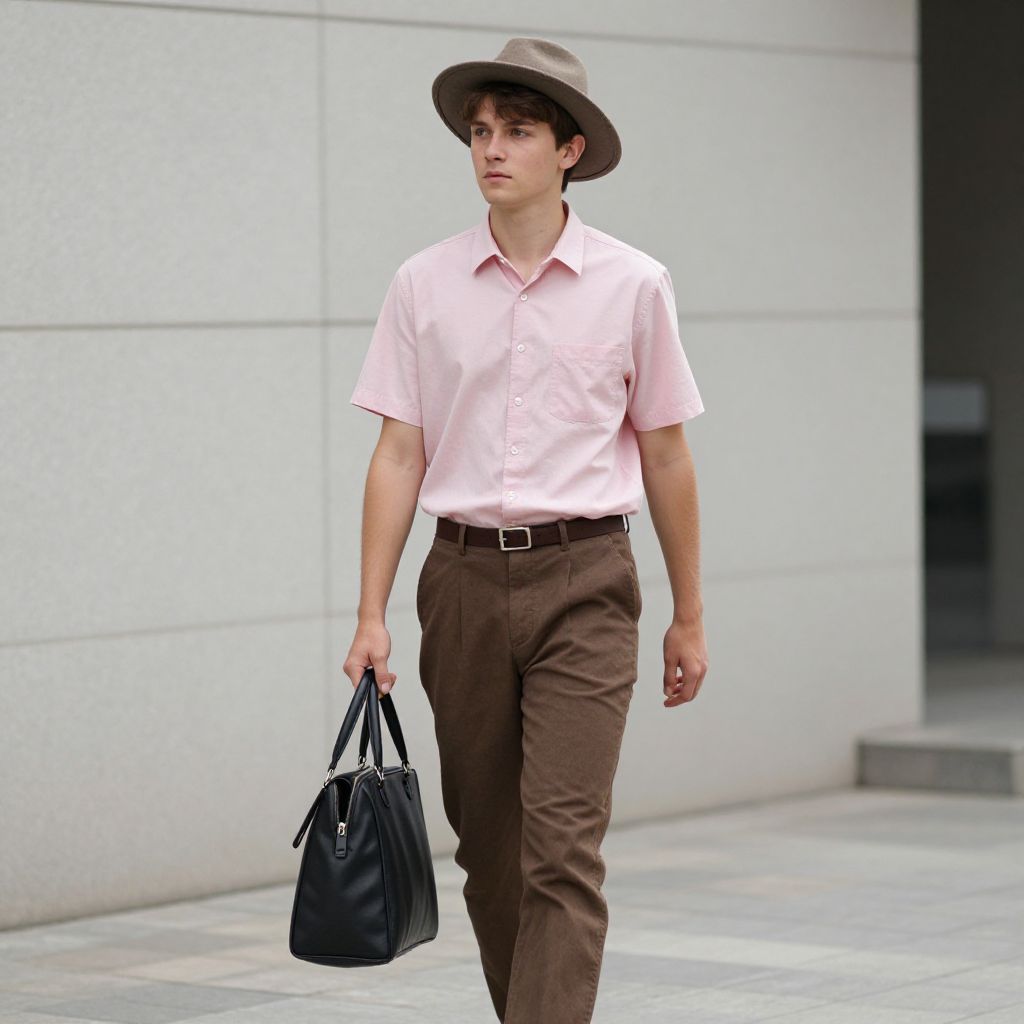 Photograph of a young Caucasian man walking outdoors in an urban setting. He has fair skin, short brown hair, and wears a light pink, short-sleeved button-up shirt, brown trousers, and a brown wide-brimmed hat. He carries a black leather handbag in his right hand and has a black belt. The background features a light gray, modern building wall with horizontal lines and a concrete sidewalk. The lighting is natural, suggesting daytime. The man's expression is neutral, and he is looking slightly to the right.